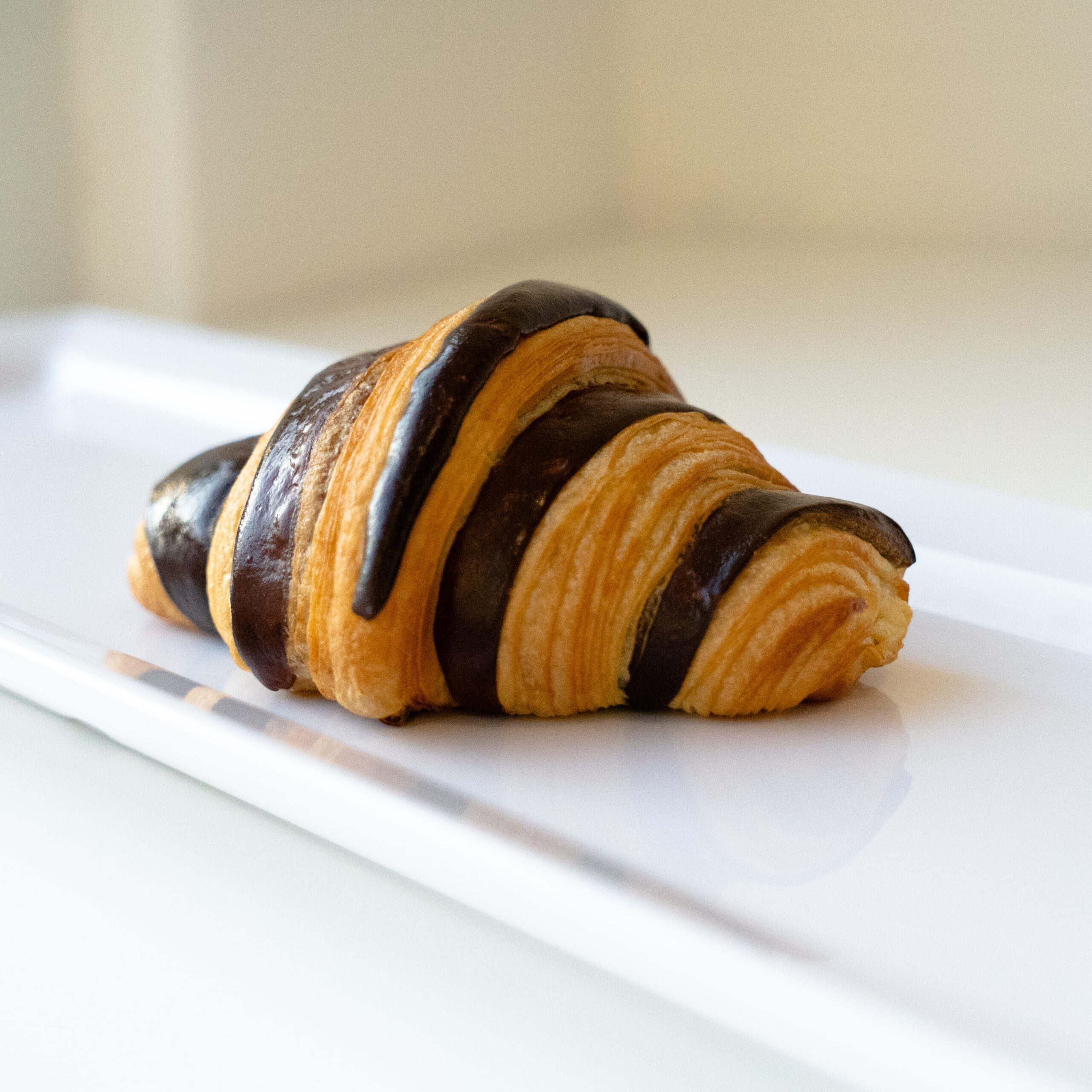 Feines Blätterteiggebäck mit zwei Stangen dunkler Schokolade.