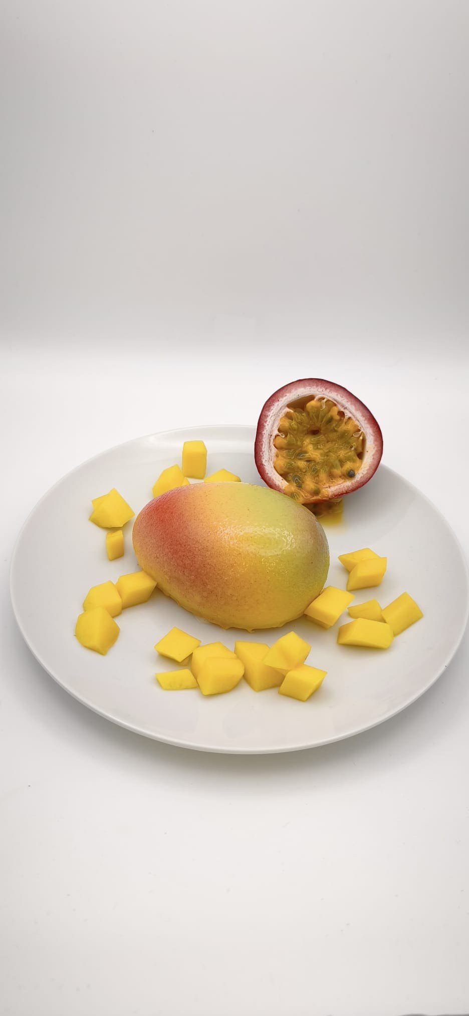 Tortenfrucht aus Biscuitboden, Cremeux Mango-Maracuja, Comptée Mango-Maracuja, Ganache-Vanille, Cacao-Butter-Schale